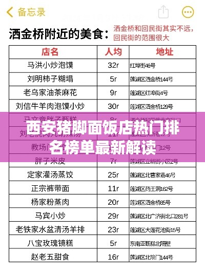 西安,这座千年古都,不仅承载着厚重的历史文化底蕴,同时也是美食的汇聚之地,近年来,随着人们对美食的追求日益升级,西安的餐饮市场也愈加繁荣,猪脚面作为西安特色美食之一,受到了广大食客的喜爱,本文将为您带来西安猪脚面饭店排名榜最新的解读,带您一探究竟。