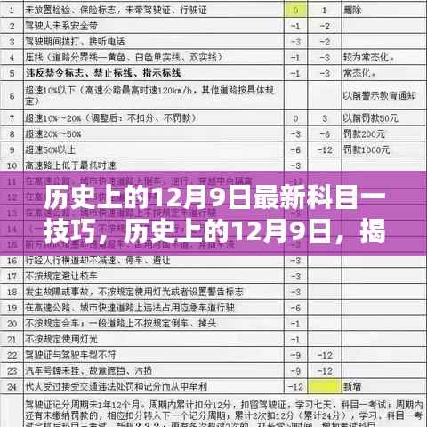 随着社会的快速发展和交通法规的不断更新,驾驶考试越来越受到人们的关注,作为驾驶考试的第一关,科目一的考试技巧尤为重要,本文将通过回顾历史上的12月9日,为大家带来最新的科目一考试技巧,帮助大家顺利通过考试。